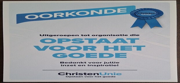 Als teken van dank ontvingen we een oorkonde voor ons vrijwilligerswerk.